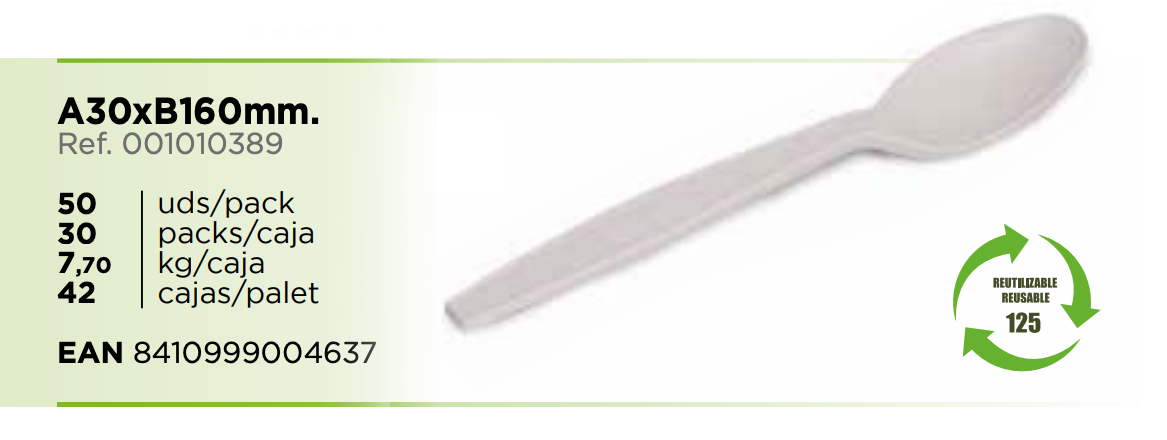 Gran variedad de cubertería, tanto de un solo uso como reutilizable: Cubertería de madera, cubertería de bambú, cubertería de maíz (reutilizable 125 usos), y cubertería de CPLA (reutilizable 25 usos). Disponibles en diferentes tamaños y formatos.
