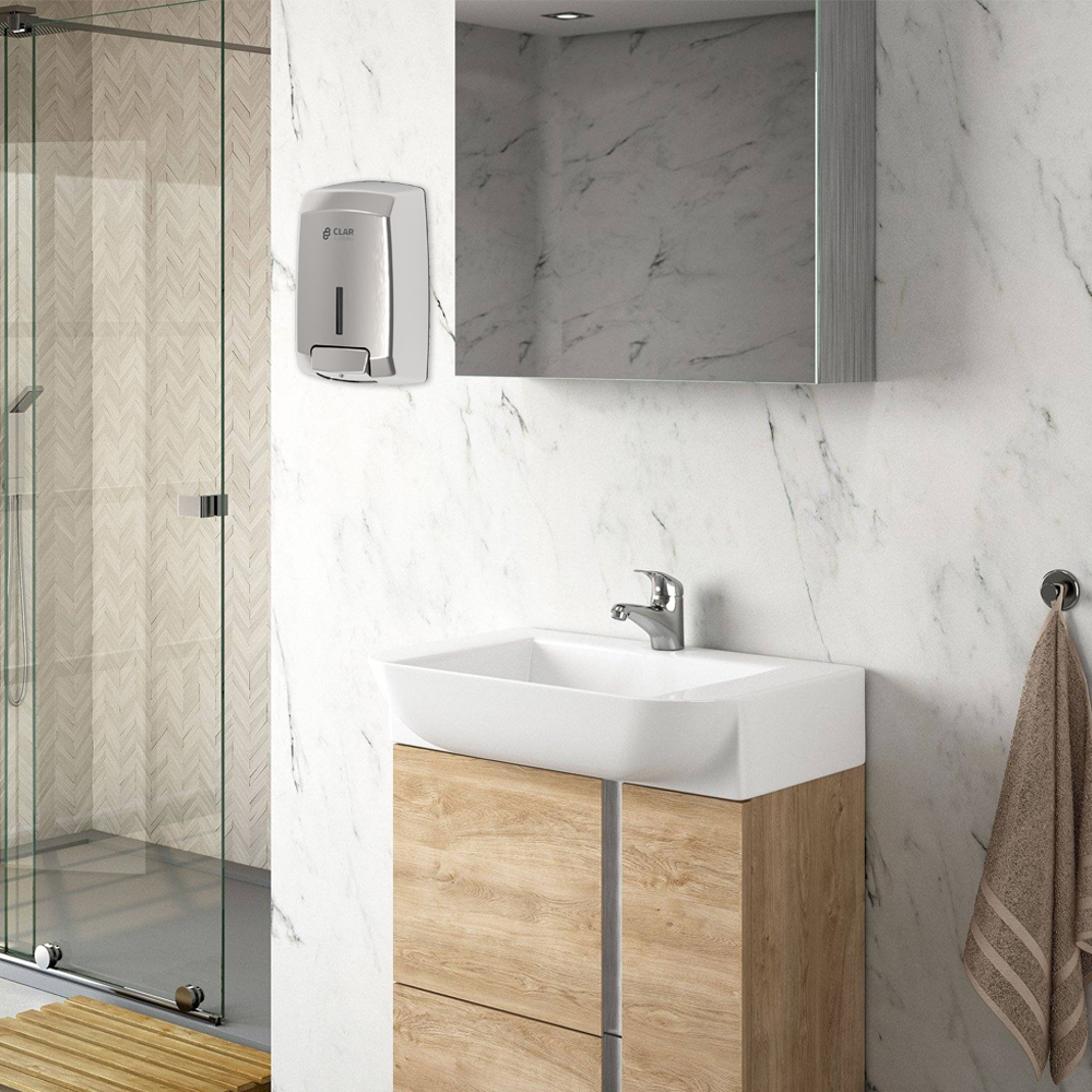 Dosificador de jabón rellenable con depósito, de 900ml línea BELLA. Fabricado en ABS, con aditivo «Antiestático» para repeler el polvo y PEHD. Recomendado para lavabos de alta frecuencia de paso. Especial colectividades. Ranura para visualización de contenido.