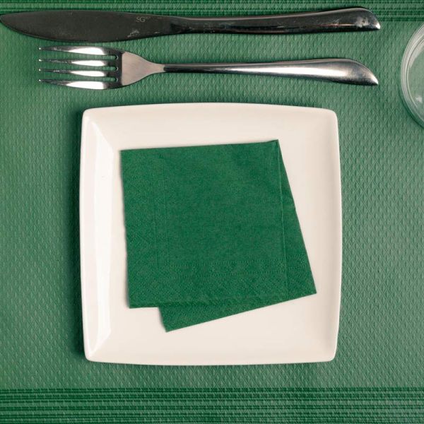 Servilletas 20×20 en color verde, prácticas, absorbentes y resistentes. Ideales para hostelería, catering y eventos con un toque fresco y elegante.